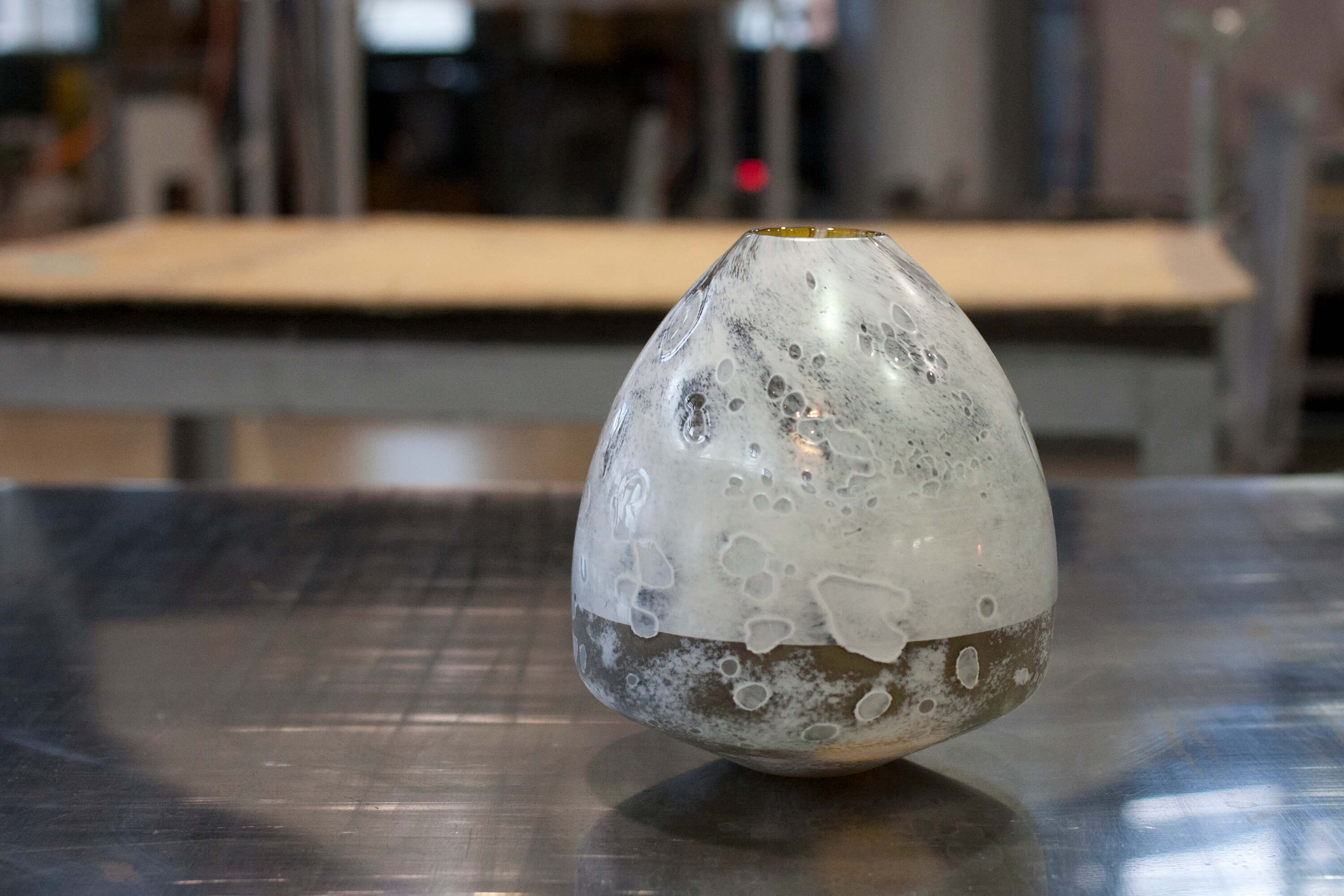 自身デンマーク滞在中に発見した表現方法を使い陶芸の様だが吹きガラスだからこそできる複雑な模様。作品一つずつが持つ雰囲気を感じて頂きたいです