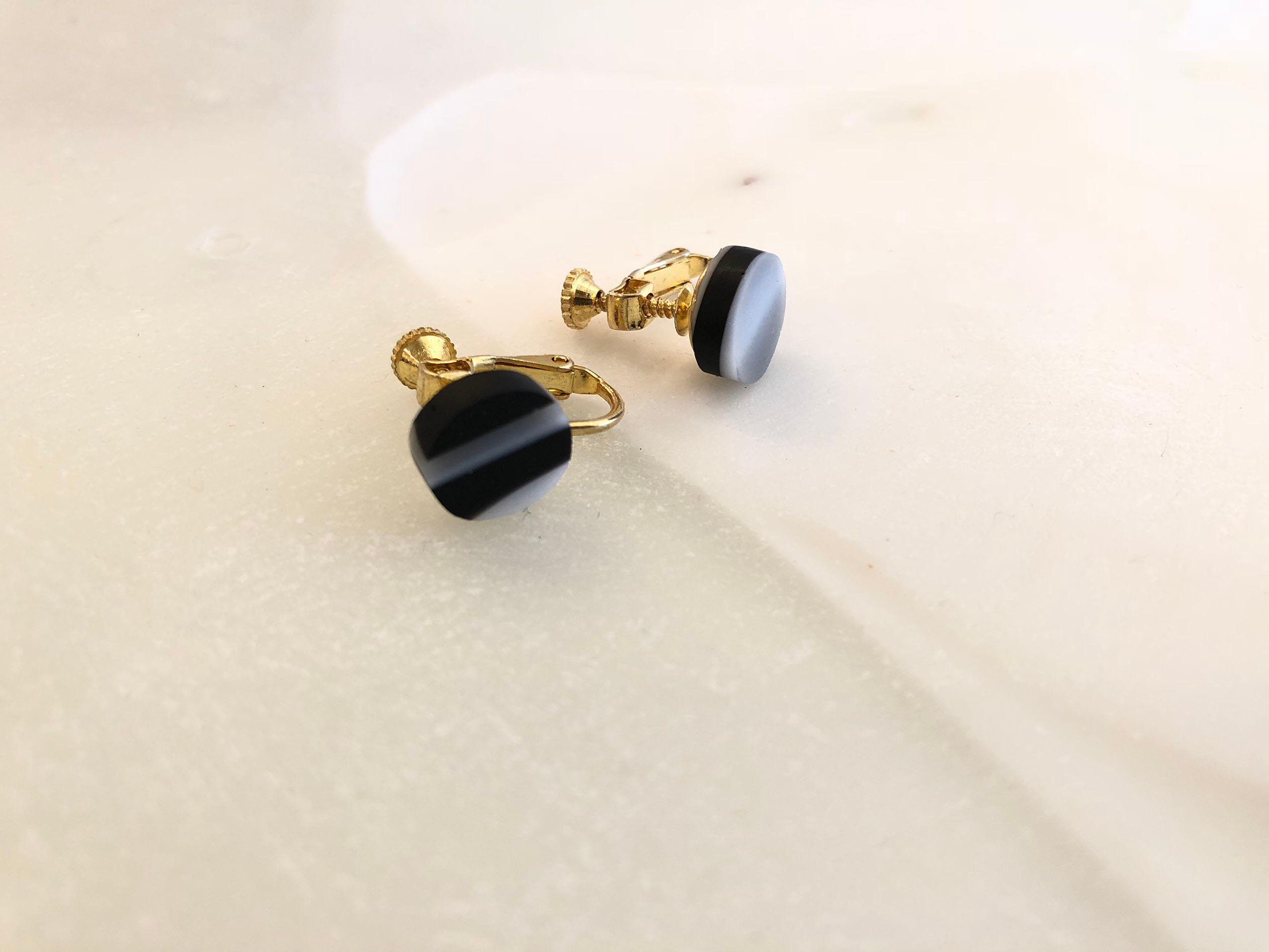 積層した板ガラスを丸く切り出したイヤリングです。