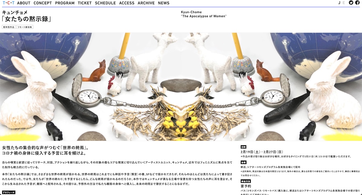 ソーシャリー・エンゲイジド・アート支援助成で、『女たちの黙示録』を制作。さまざまな立場の女性に話を聞き、現在、彼女たちが抱えている不安や恐怖をもとに「世界の終わり」の物語を紡いだ。また、そこで生み出された、女性たちの考える「世界の終わり」を配布型アート/演劇へと発展させた。
