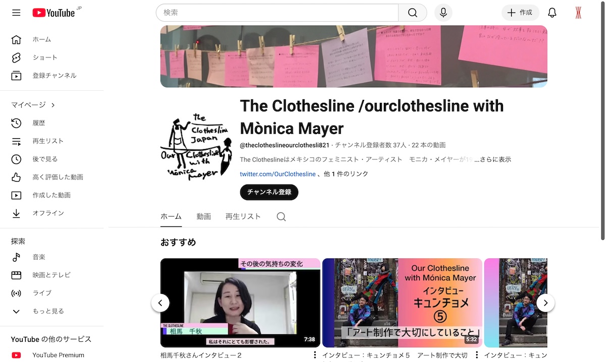 トリエンナーレでの活動を通して、『The Clothesline』の周知、《The Clothesline》の再展示の必要性を感じていた我々は、新型コロナのまん延防止等重点措置、緊急事態措置の下での活動を鑑み、オンラインでの活動を中心に行った。YouTubeチャンネルを開設し、『The Clothesline』についての説明動画を、《The Clothesline》の体験を共有するために関わってくれた方々へのインタビュー動画を制作・配信した。最初にモニカ・メイヤーに『The Clothesline』の説明と日本での展開について、またフェミニズムやフェミニスト・アートについて語ってもらった。また、トリエンナーレで展示再開のアクションとして行われた「Re:Freedom_Aichi」のプロジェクト、「Y/Our Freedom」で『The Clothesline』のコンセプトを用い、「Our Clothesline」メンバーとともに扉の前でファシリテーションを行った、アーティストユニットのキュンチョメにインタビューを行った。上智大学で開催された「The Clothesline」は、明日少女隊とのエンパワーメントマーチ、在日メキシコ大使館とのワークショップなど、いろいろなイベントと並行して開催された。