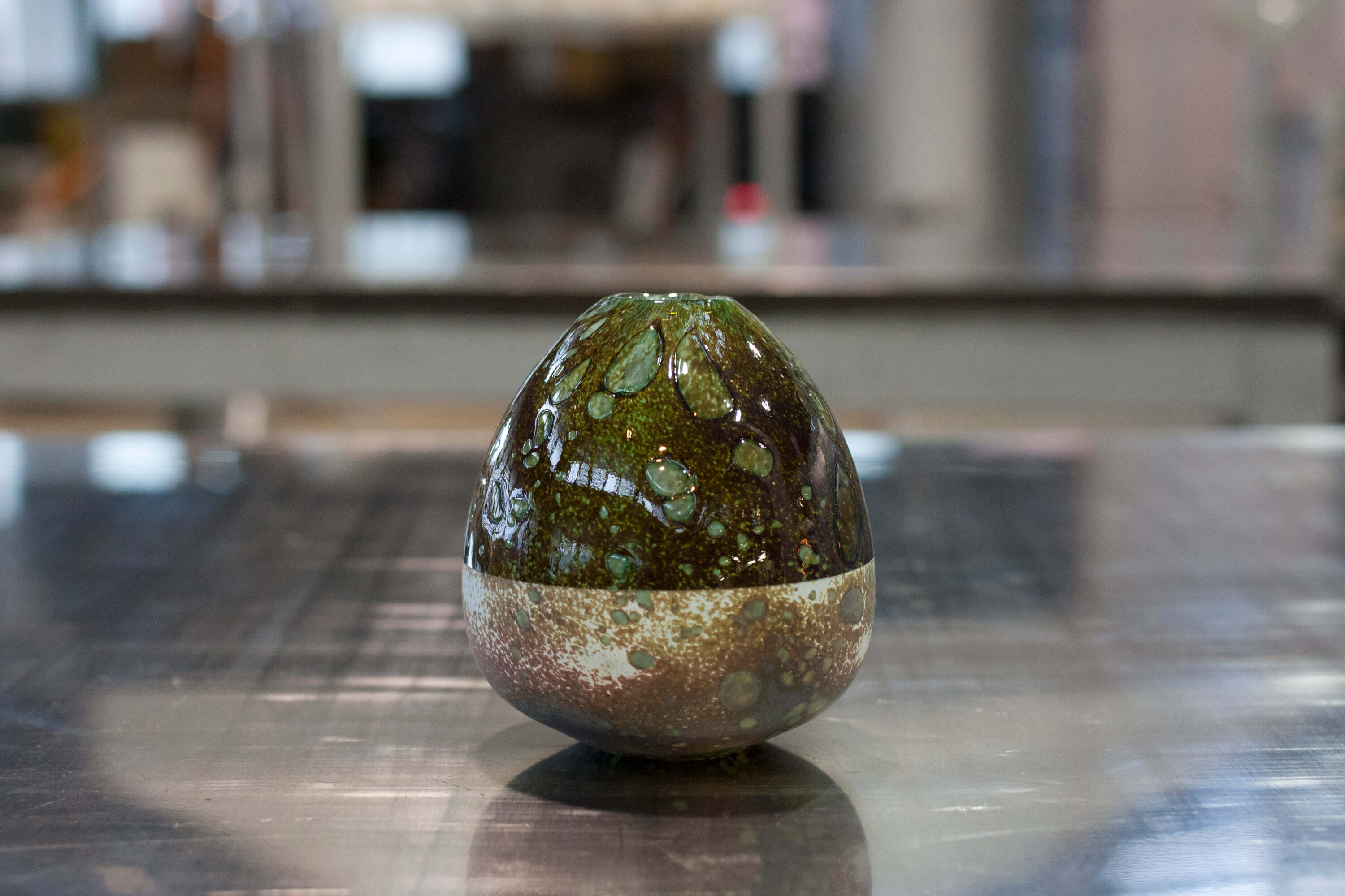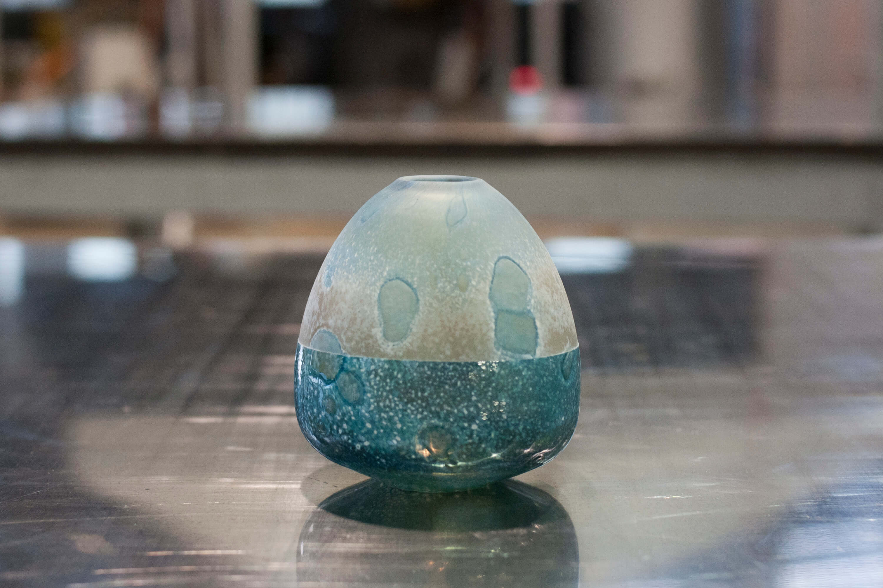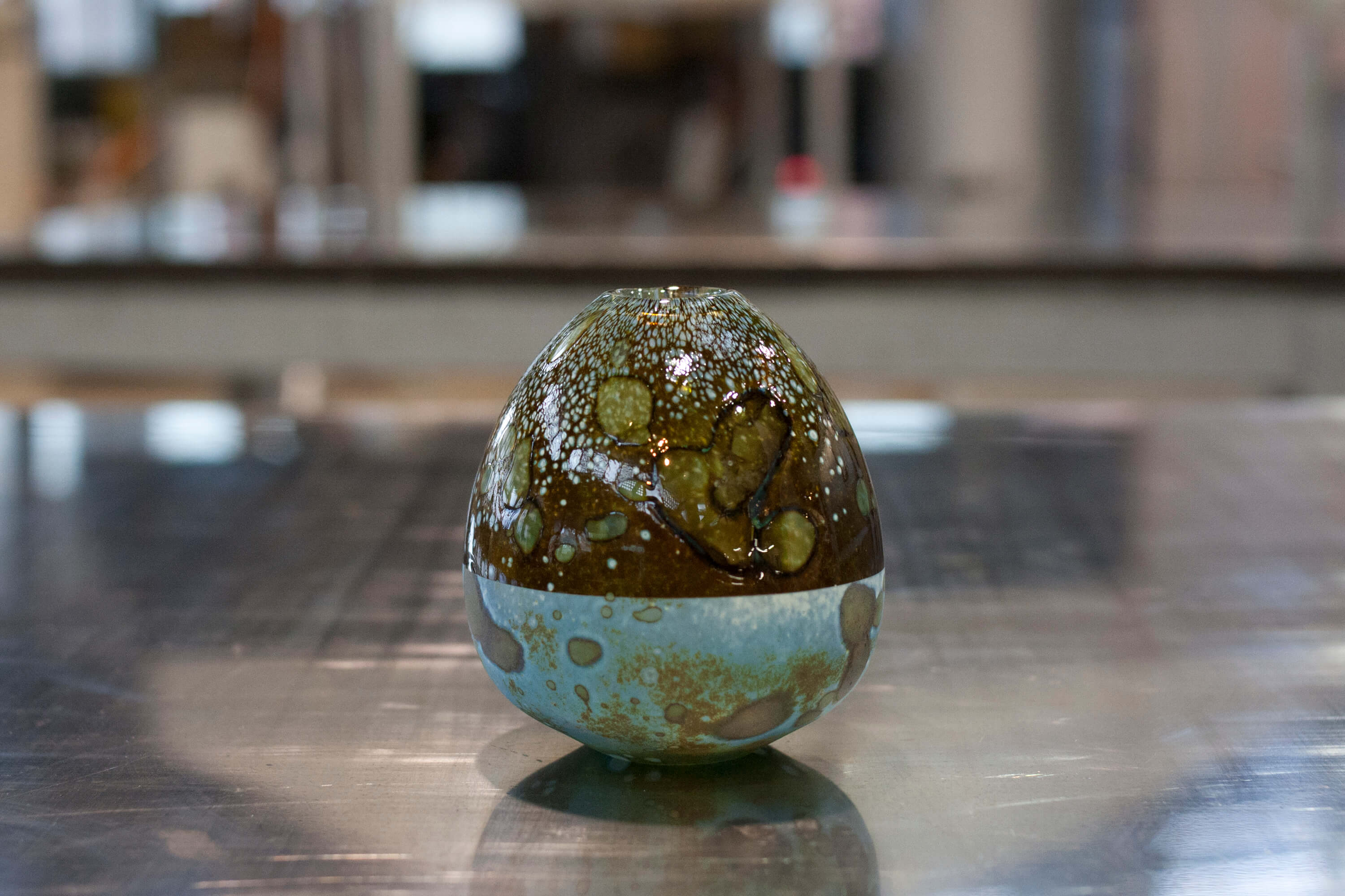 自身デンマーク滞在中に発見した表現方法を使い陶芸の様だが吹きガラスだからこそできる複雑な模様。作品一つずつが持つ雰囲気を感じて頂きたいです